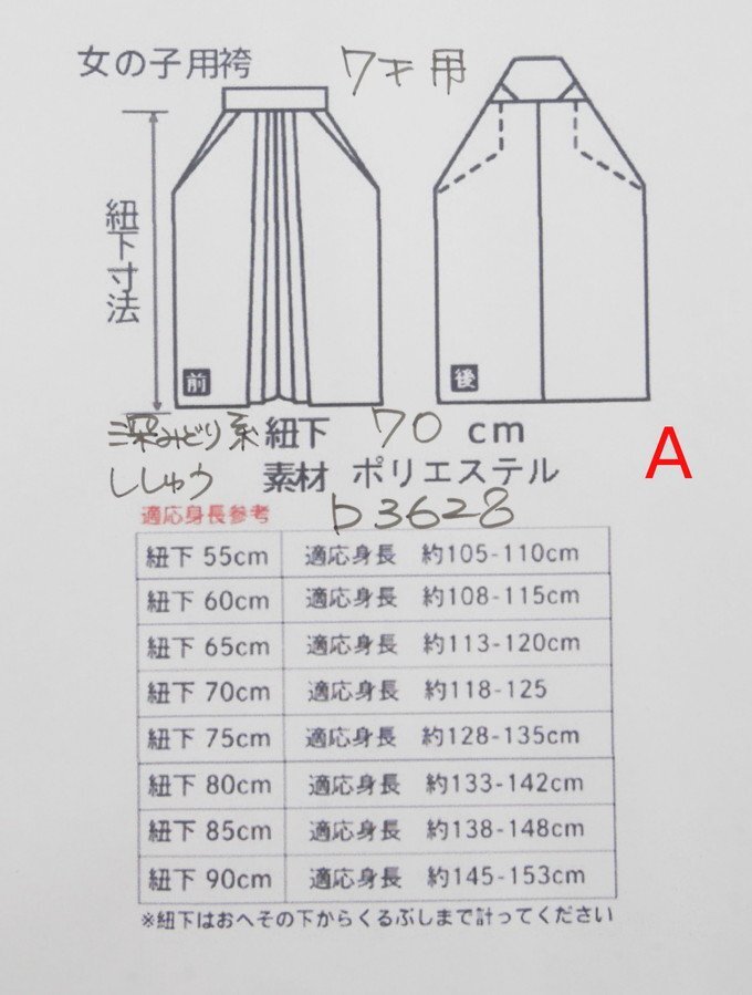 女の子の袴 の販売です お気に入りの着物とコーディネイトしてください。 こちらのお品物は特に目立つ汚れ等はありません。 洋装も可愛いですが、日本の伝統美着物でお祝いしてくださいね♪ 七五三、お正月、節句など お祝い着として是非おススメです♪ セット内容は画像をご確認ください。 未使用品ですが経年による汚れやヤケなどがある場合があります。 気になる方は入札をお控えください。 返品交換はお受けできませんので予めご了承の上ご入札は慎重に行って下さい。 素材:一番最後の画像をご参照ください。 サイズ:一番最後の画像をご参照ください。 子ども着物特集ページはこちら ↓↓↓↓↓↓↓↓↓↓↓↓↓↓ 【出品中!!!!】 ※検品のうえ商品の状態をランクで記載しておりますが、 見落としによるシミや汚れがある場合がございます事をご了承下さい。 ◇参考サイズ◇ 身長 袴丈(紐下) 80cm ==35-40cm 1才前後 95-100cm==45-50cm 3才前後 110cm ==55-60cm 数え5才前後 115cm ==60-65cm 満5才前後 120cm ==65-70cm 6-7才前後 ※身長と袴丈の関係はあくまでも目安で個人差があります。 ※色の出方が異なる場合があります。 ※お使いのディスプレイによっては実物の色と違って見える場合がございますので、予め御了承ください。 | |||