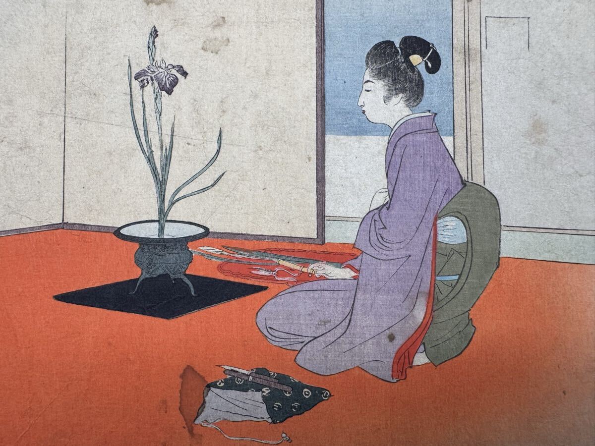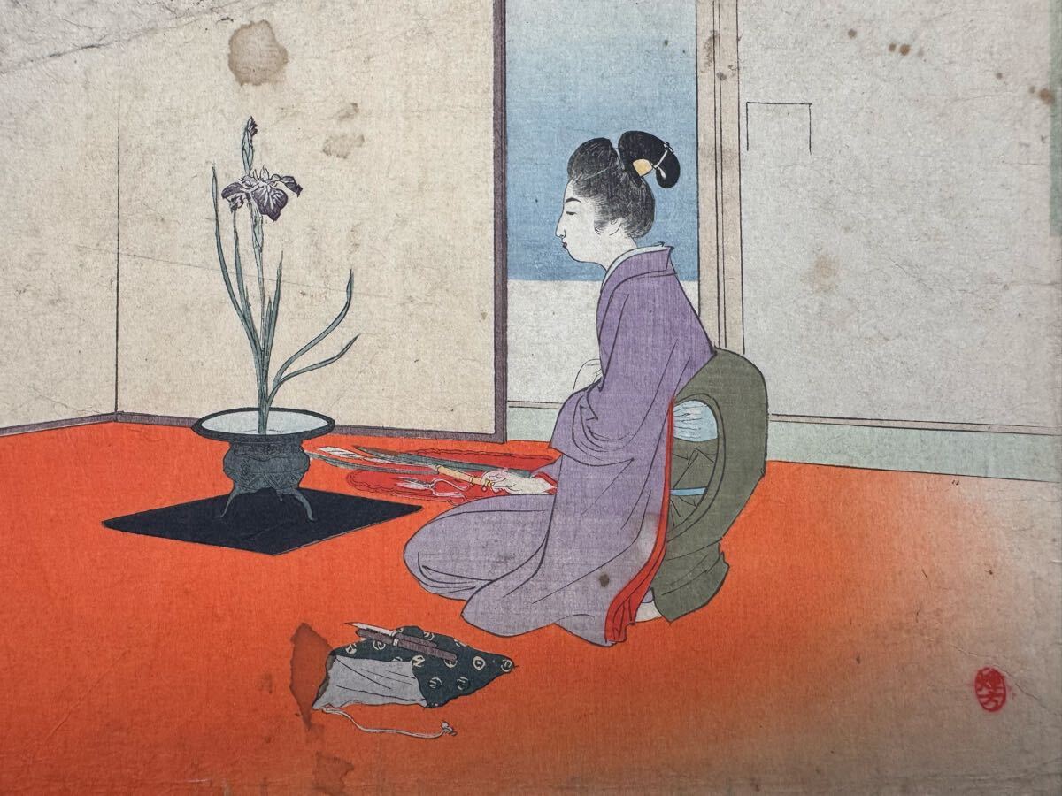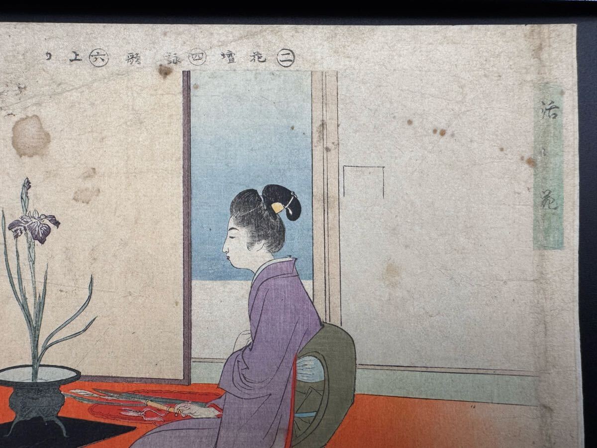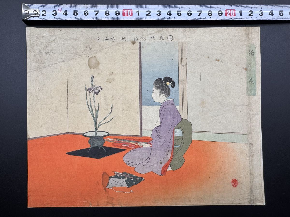 【真作】口絵 本物浮世絵木版画 池田輝方「活花」美人図 明治期 中判 錦絵 裏打ち 保存良い 清方 年方 桂舟 半古 広業 月耕 永洗 華邨