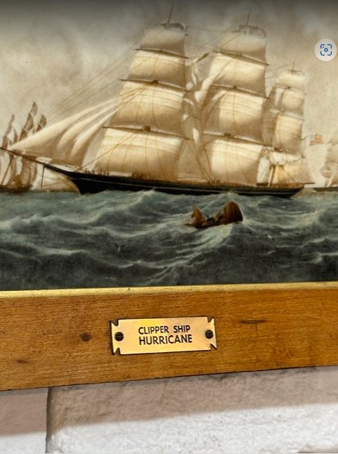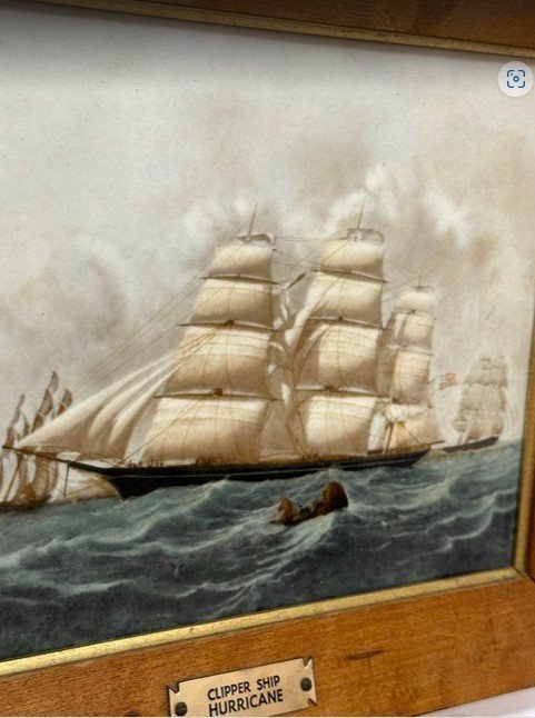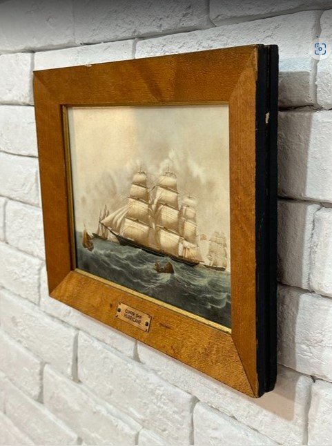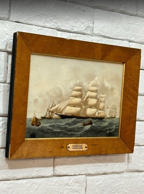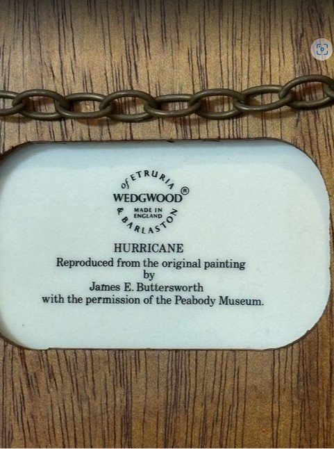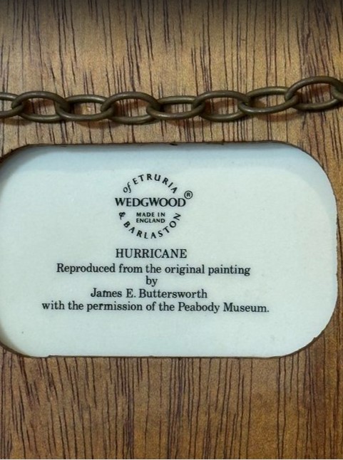 ヴィンテージの1970年代イングランドウェッジウッド磁器「ハリケーン」クリッパー船塗装プラークウッドフレームです。