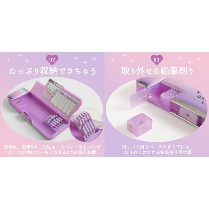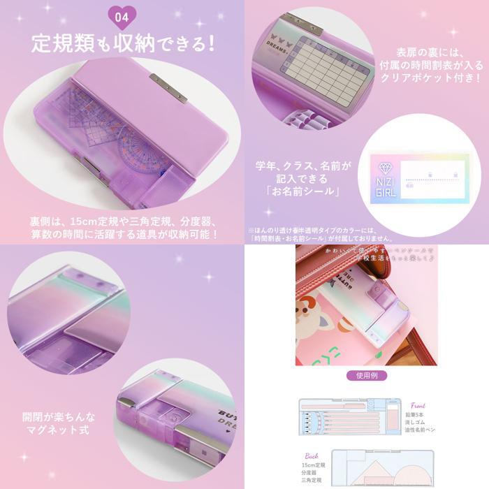 | 商品説明 | ・・ガーリーなグラデーションカラーに、オーロラワッペンやバタフライロゴが映える!PETIT LARME(プチ・ラルム)ソフトペンケース。 ・両面開きで使いやすいボックス型筆箱。スリムなのにたっぷり収納できちゃうのが嬉しい♪ ・オモテ側には、鉛筆5本・油性ネームペン・消しゴムが所定の位置にきっちり収まる2つの扉を配置。5本の鉛筆が収まるホルダーは可動式なので、取り出しがスムーズ。 ・オモテ側の扉の裏には、付属の時間割表が入るクリアポケット付き!明日の授業に使う勉強道具の準備がラクラク。 ・消しゴム用スペースのすぐ下には、取り外しのできる鉛筆削り器が付属していて、とっても便利!削りカスもワンタッチで捨てられる♪ ・ウラ側の扉には、15cm定規や三角定規、分度器など算数の時間に活躍する道具がすっきり収納可能。 ・オモテ・ウラ・消しゴムスペースの扉は、開閉が楽ちんなマグネット式。ぷにぷにソフトな触り心地がクセになる! ・学年、クラス、名前が記入できる「お名前シール」が付属しているので、お友だちとお揃いのペンケースでも大丈夫♪ |