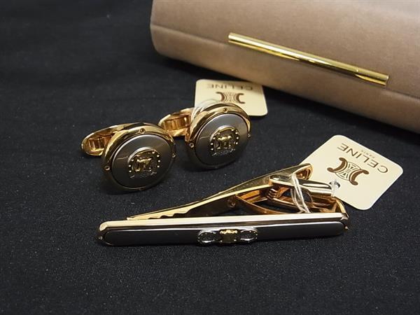 ■美品■ CELINE セリーヌ マカダム カフスボタン ネクタイピン アクセサリー 2点セット 紳士 メンズ シルバー系×ゴールド系 DK5171