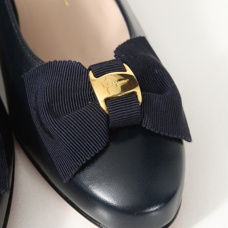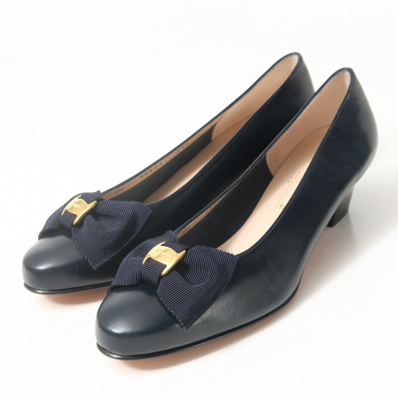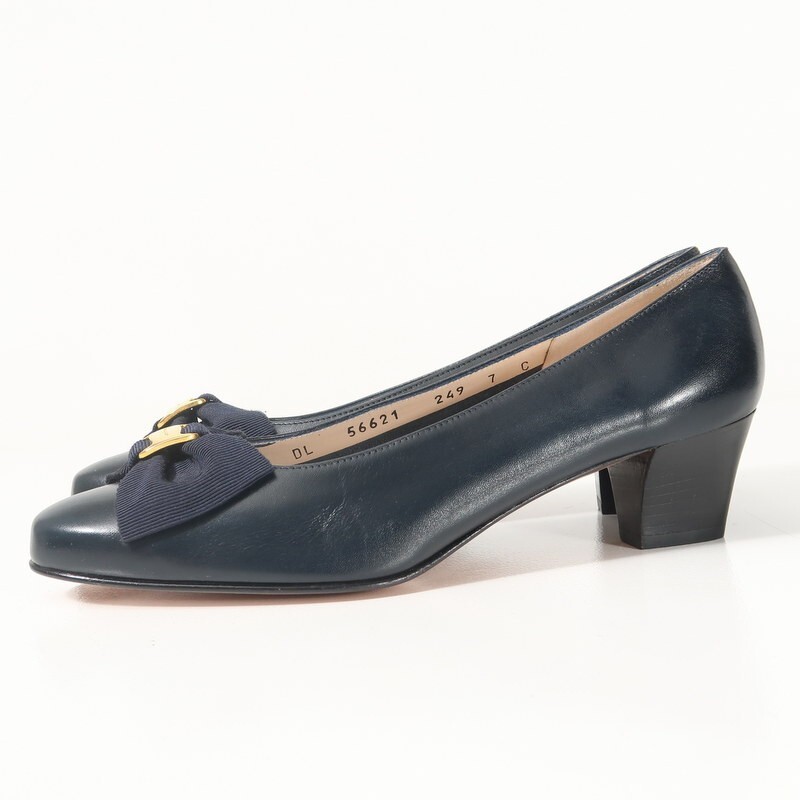 GS3928*未使用 サルヴァトーレフェラガモ 7C(24cm相当) ヴァラ グログランリボン レザーパンプス 靴 ネイビー Salvatore Ferragamo | |||