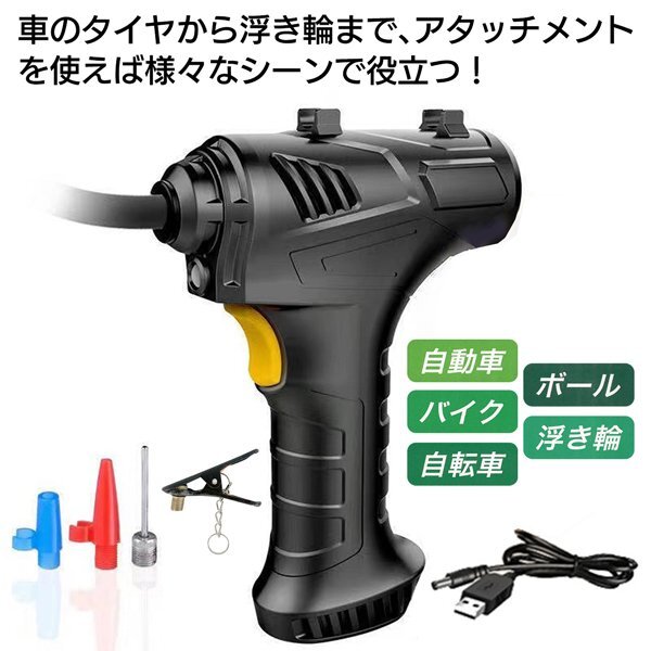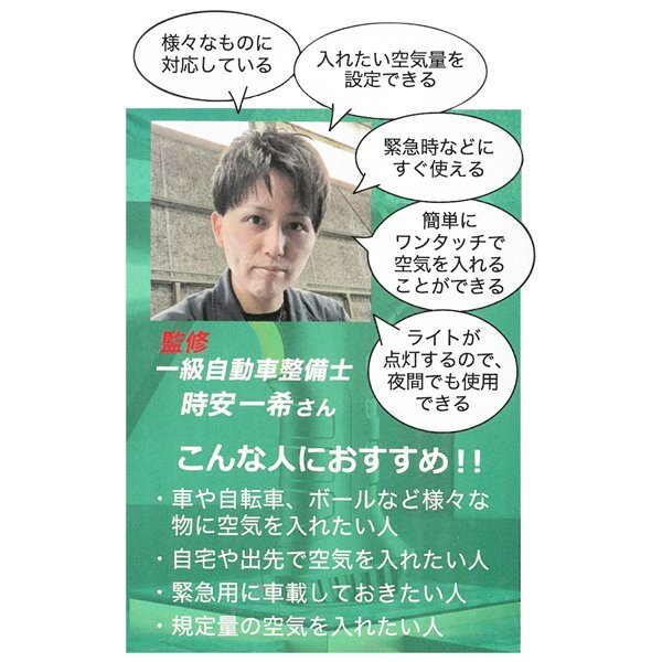 | 車やバイク、自転車、ボール、 浮き輪などに空気を注入! 必要な各アタッチメントも付属。 |