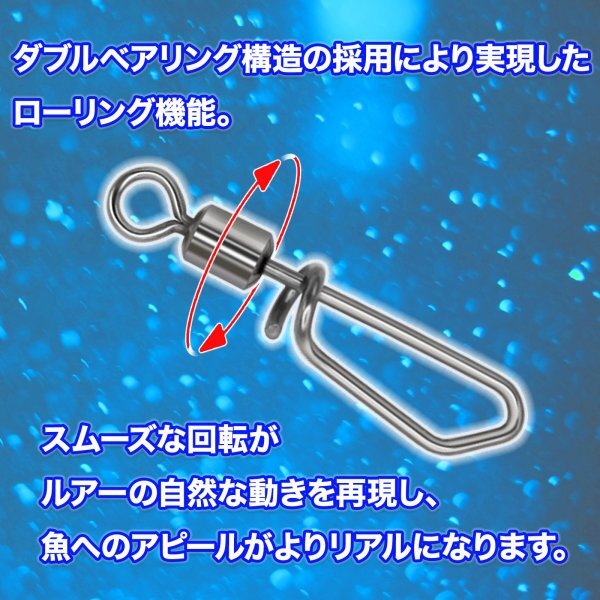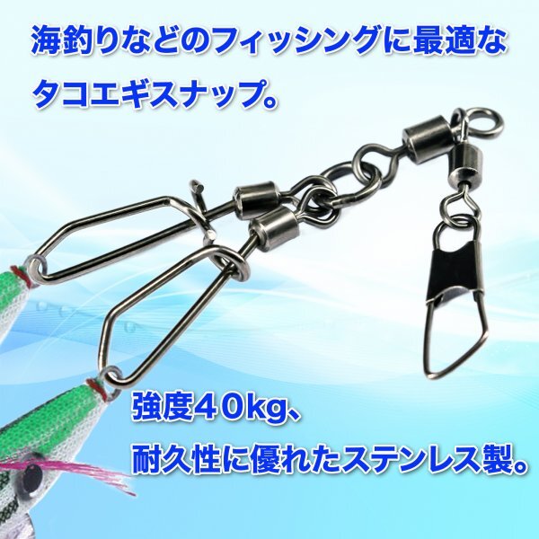 【高性能ベアリング】このタコエギスナップは高性能なベアリングを搭載しており、スムーズな回転を実現します。これにより、ルアーの動きがより自然になり、魚の食いつきを向上させます。釣果を最大化するための必須アイテムです。