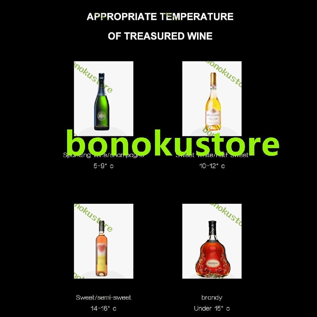 名前: 電子ワインクーラー ボトルの数: 8 温度:8~18℃ 電源: 220-240V/50-60HZ----70W 正味重量: 9KG 総重量: 11KG 製品の特徴: 空冷
