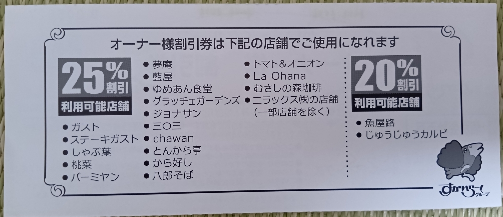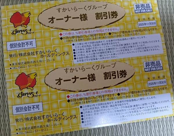 ②11/30 2枚 すかいらーく オーナー様 優待券 割引券 クーポン券 株主 25% 20% 飲食 ファミレス ガスト バーミヤン しゃぶ葉 ジョナサン他