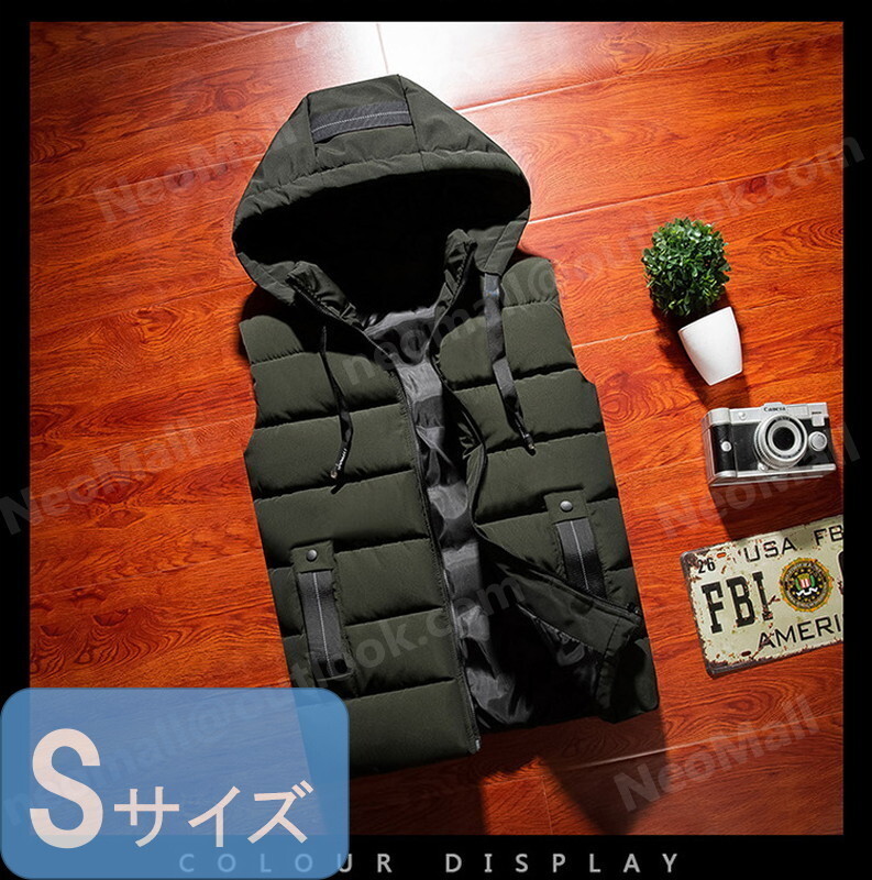 フードが外せる メンズ ダウンベスト 001 グリーン Sサイズ 中綿ダウン 中綿ベスト キルティング アウター 防寒 秋冬 暖かい