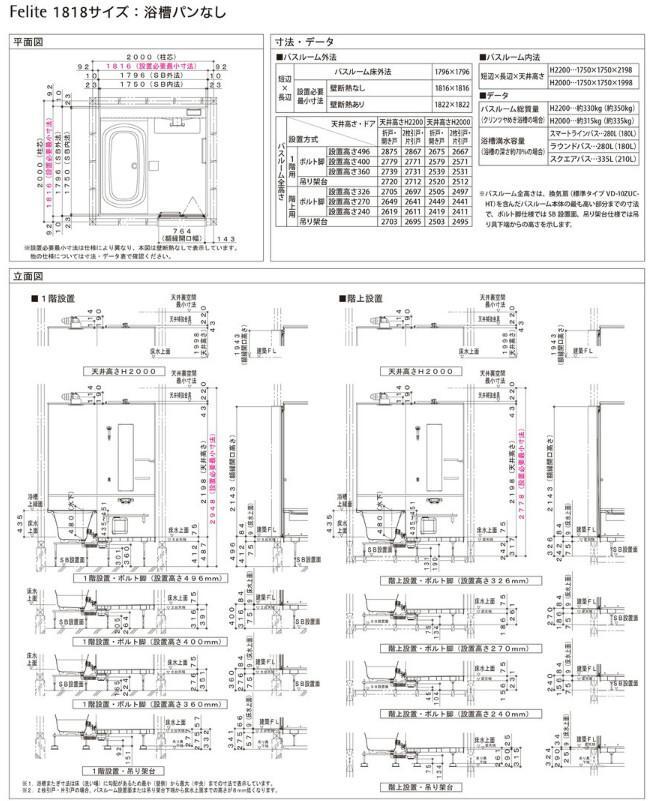 ◆システムバス設置必要寸法W1816×D1816×H2898㎜。ボルト脚360㎜の時。