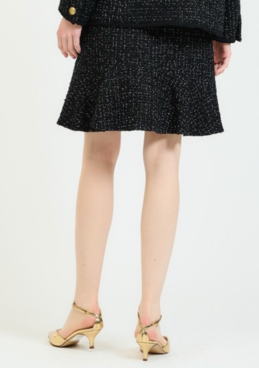 バックスタイルがポイントのミニスカート。今年のトレンド素材でもあるファンシーツイードは、光沢や凹凸のある糸使用することで生地に表面感が出るように作られたオリジナル素材です。スカートのヒップ下から切り替えてフレアを入れたデザインにしています。歩くたびに揺れ動くフレアがポイント。