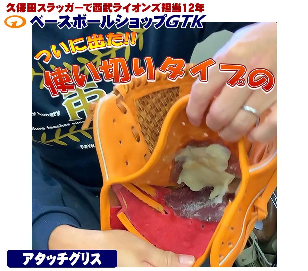 即購入したい場合は「今すぐ落札」ボタンで落札してください。 【使用用途】 グラブの捕球面と平裏面(手の平が当たる面)の2枚の革を繋げるグリスです。 グラブ1個分の使い切りタイプです。 15g前後です。多少前後しますのでご了承下さい。 グラブを使い込んでいくとグリスが減り革と革の密着が弱まり浮き上がるようになります。 この状態になるとボールを捕ろうとグラブを握った時に平裏の革は動きますが 捕球面の革は動きません!!! は、大袈裟ですがコンマ何秒か遅れが生じますし、うまく力が伝わらず意図した動きにならない場合があります。 こうなったら「アタッチグリス」の出番です。グラブの性能がかなり回復し、元の捕り易いグラブへ戻ります。 新品のグラブには100%入っております。グラブのリフレッシュに最適なアイテムですのでぜひご利用下さいませ。 なお、グラブの分解に自信が無い方は当店にて加工を行いますのでお問い合わせ下さい。 【内容量】 8cm×6cm×3cmの容器に入っています。重量は容器込みで100g前後です。多少前後しますのでご了承下さい。 グラブや硬式ボールは付属しませんのでご了承ください。 日曜・祝日・祭日は定休日のため発送出来ません。翌営業日に発送しますので予めご了承ください。 配送方法は宅配便かメール便です。 それではノークレーム・ノーリターンでよろしくお願いいたします。 | |
