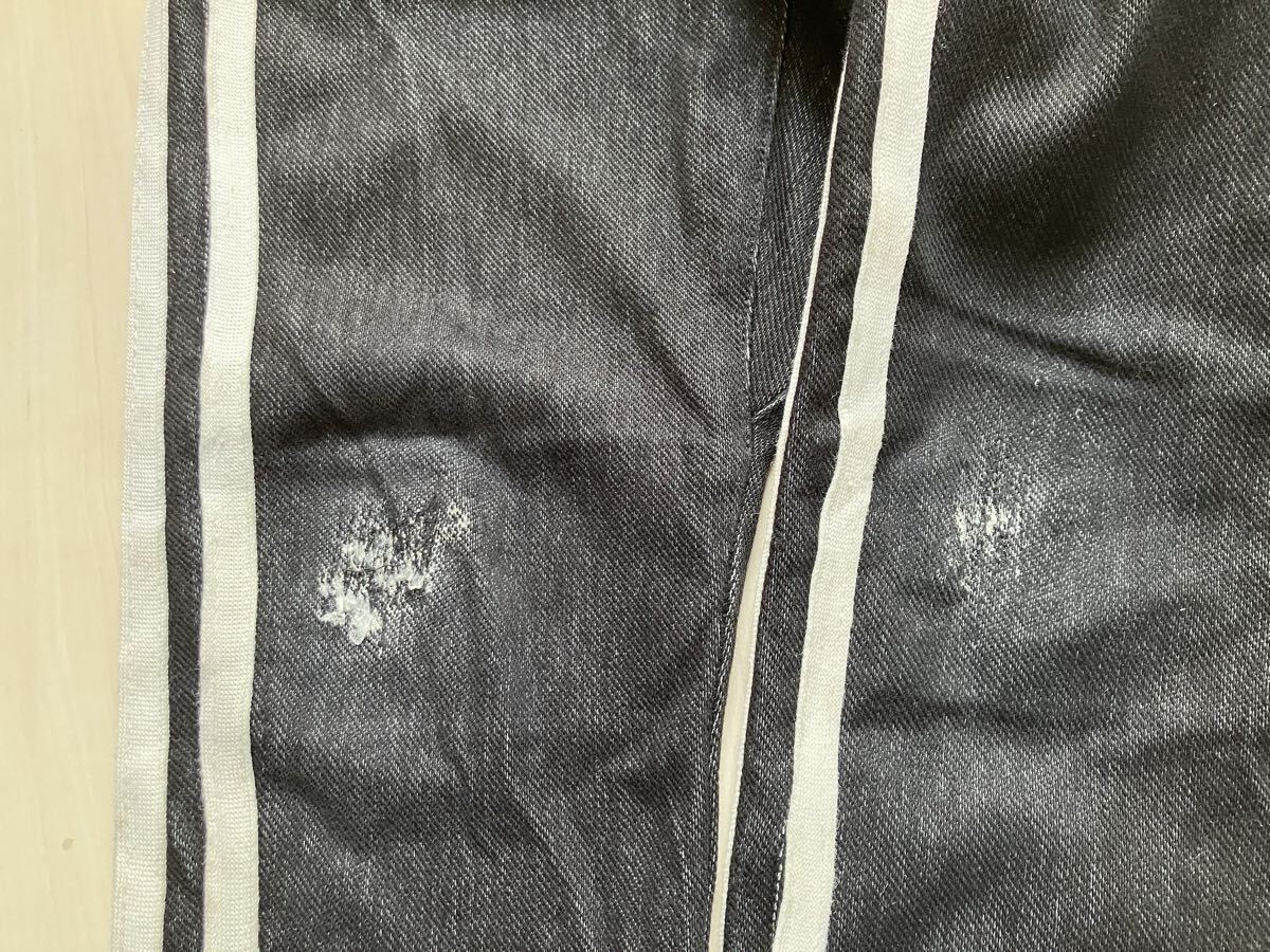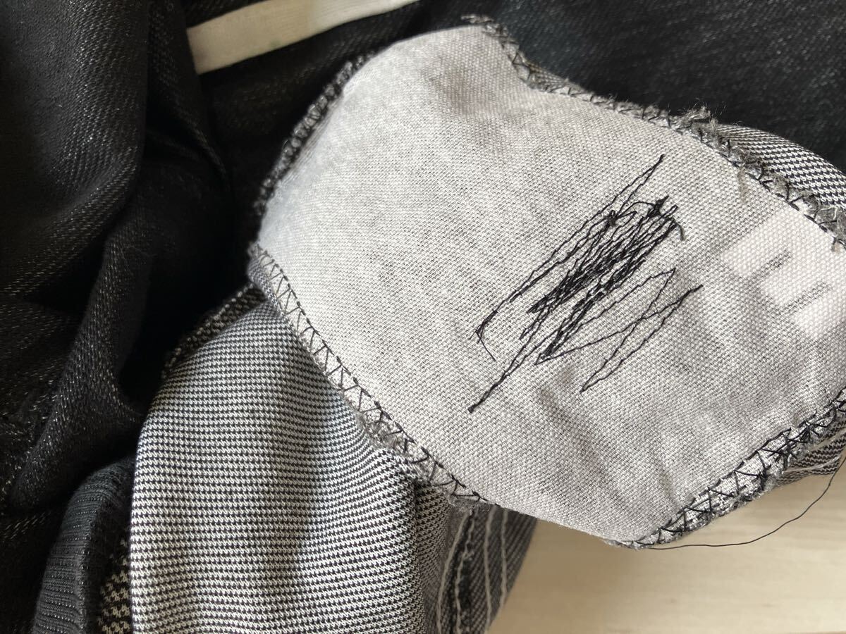 片膝が擦れて生地が薄くなってきたので、裏から補強しています(画像参照)。