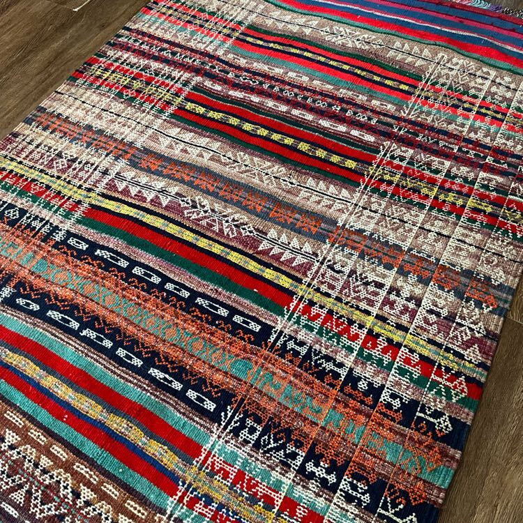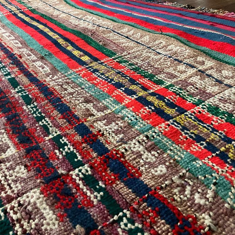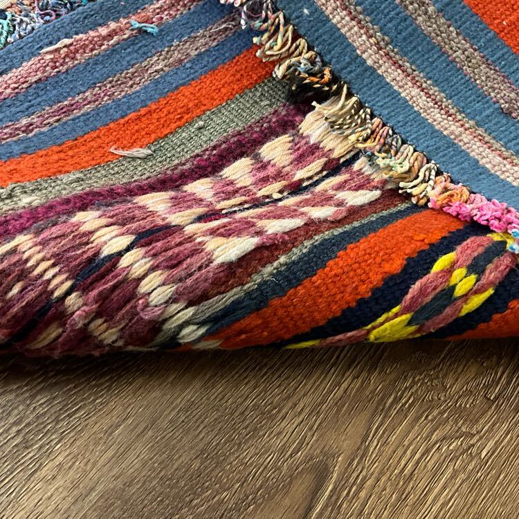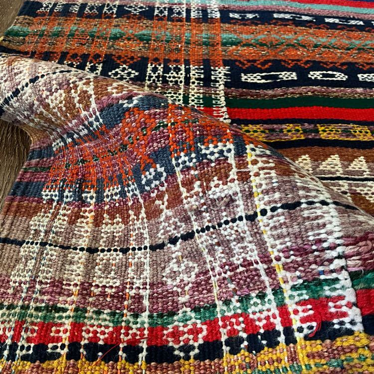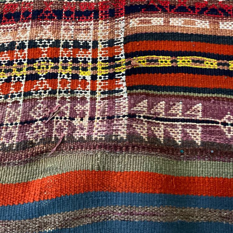 ★大型キリム★下部左側などに経年による擦れがございます。しなやかで丈夫な織り、刺繍のように表現された細かな織り柄が全体に並ぶオススメの一枚です。遊牧民の生活文化に欠かせないキリム。平織りのキリムは肌離れが良く、屋内だけでなくアウトドアでご使用いただいても雰囲気抜群です。(画像をご確認下さい。) (ハンドメイド特有の歪みがございます。)