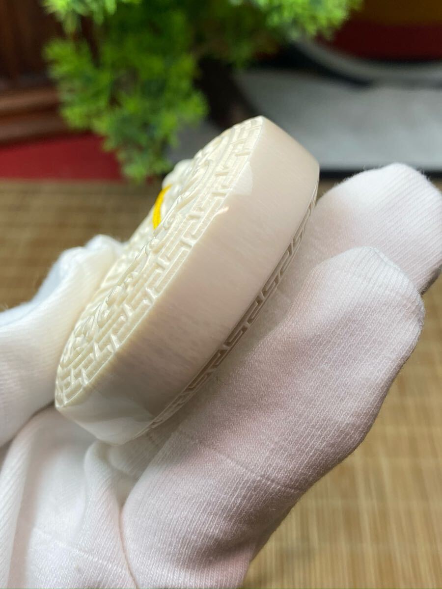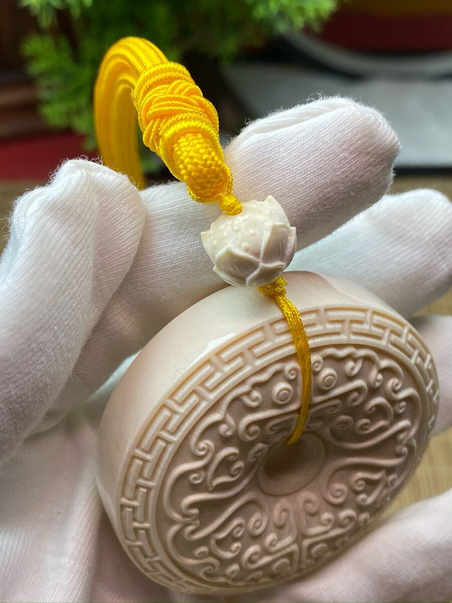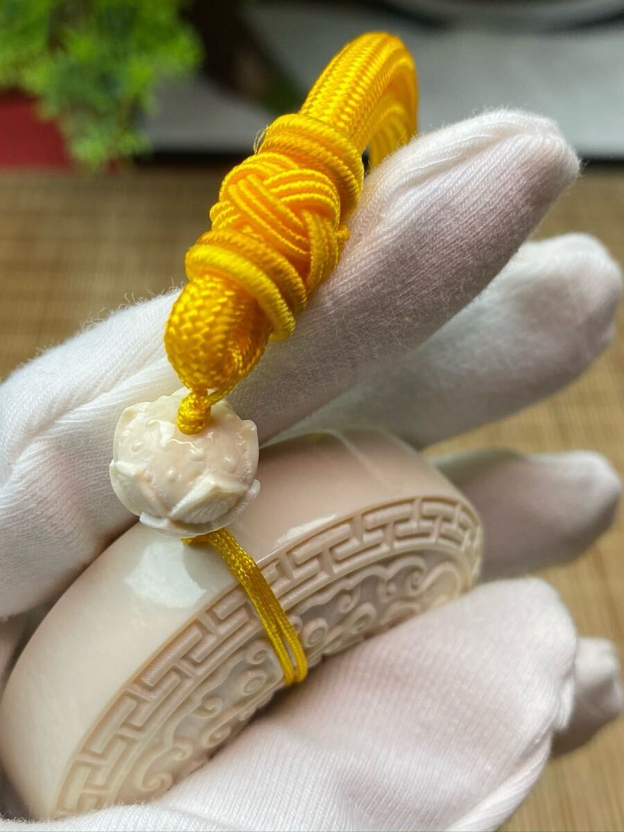 【祥雲ドーナツ形】手持ち物。材質が潤くて繊細で、牙紋がはっきりで、彫刻工が精巧で、寓意は吉祥如意です。蓮花の頂珠を組み合わせて、素晴らしいです。