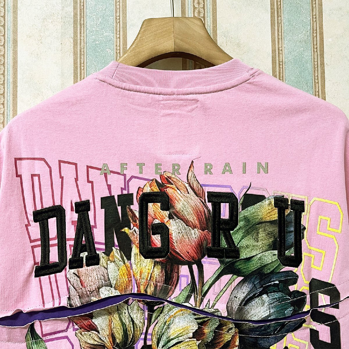 定番の丸首ネックデザイン、着脱しやすい。バックにはバラ柄を大胆に落とし込み、注目度が高くてレトロな雰囲気が漂うデザインに完成。左胸元には綺麗な英字の刺繍を入れ、カジュアルな中にさりげない大人っぽさを演出してくれる。一枚を着るだけで、オシャレを1歩リードするコーデのアクセントになる。