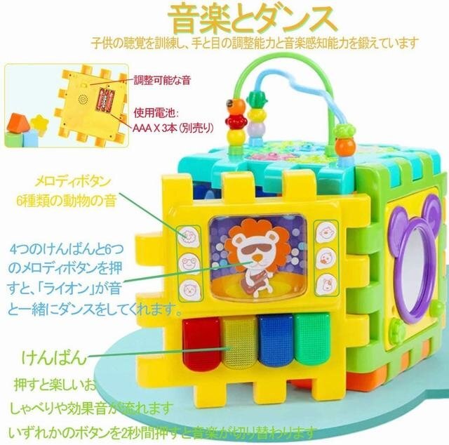 *多機能のプレイ方法,音楽玩具* このおもちゃは一つのコンパクトな木製キューブに七つの機能を統合し、お客様がお金を費やすの価値があり、子供たちをより楽しくになるために、これは子供たちが親や友達と遊ぶことを可能にし、もっとインタラクティブで居心地の良い雰囲気を作り出し、それから、子供と他人の合作を助けることができ、目と手の調和を練習するのに役立ち、入学前の認知技能を発展することができます。 *知育玩具* 女の子と男の子共用の知育おもちゃ、両手の運動能力を高め、脳の発達を促進させます。 *?み立ては必要がありません* 箱から出して、すぐにご使用いただけます。子供と遊ぶ親子の時間をよくお楽しめます。
