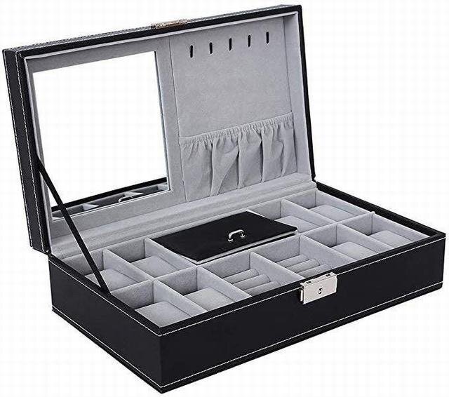 ミラーが付いていますので、ピアスを装着するときやちょっとした身だしなみを確認する際に非常に便利です。 また、便利な鍵付き、大切な腕時計やメガネを守るコレクションケースです。