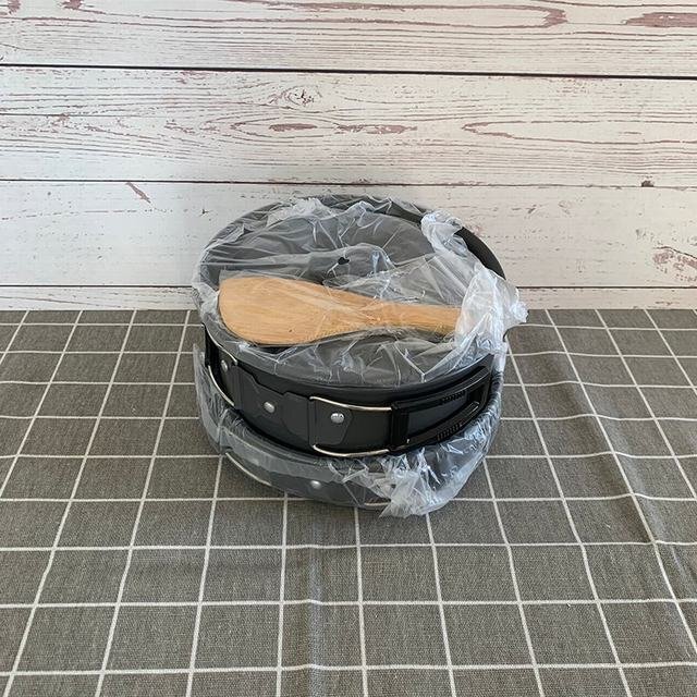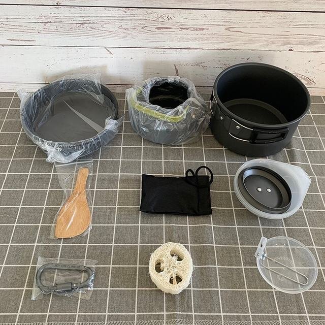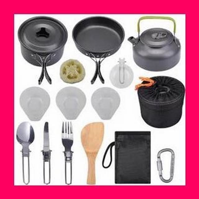 【製品の説明と仕様】 材料:鍋セット本体/超軽い酸化アルミニウム ハンドル/アンゼン食品級のシリコンとステンレス 重量:1050g 使用人数:2~3人(推薦) 鍋:17cm x 9cm フライパン:18cm x 4.5cm やかん:15cm x 8cm 付属品:PP材お碗お碗x3 竹しゃもじx1 スポンジx1 ナイフ×1 フォーク×1 スプーン×1 Dリング×1 収納袋 ×1