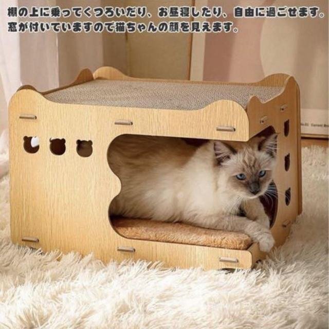 上下2段に爪研ぎがついて爪を研ぐことができます。中は広すぎずほどよく狭く、猫も居心地が良いです。中に入れるし、上に乗るのも可能で、そして好奇心いっぱいの猫ちゃんが小窓から外の様子を確認できます。
