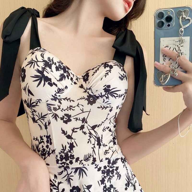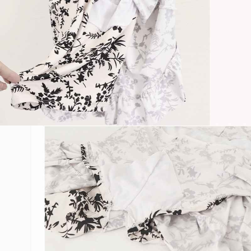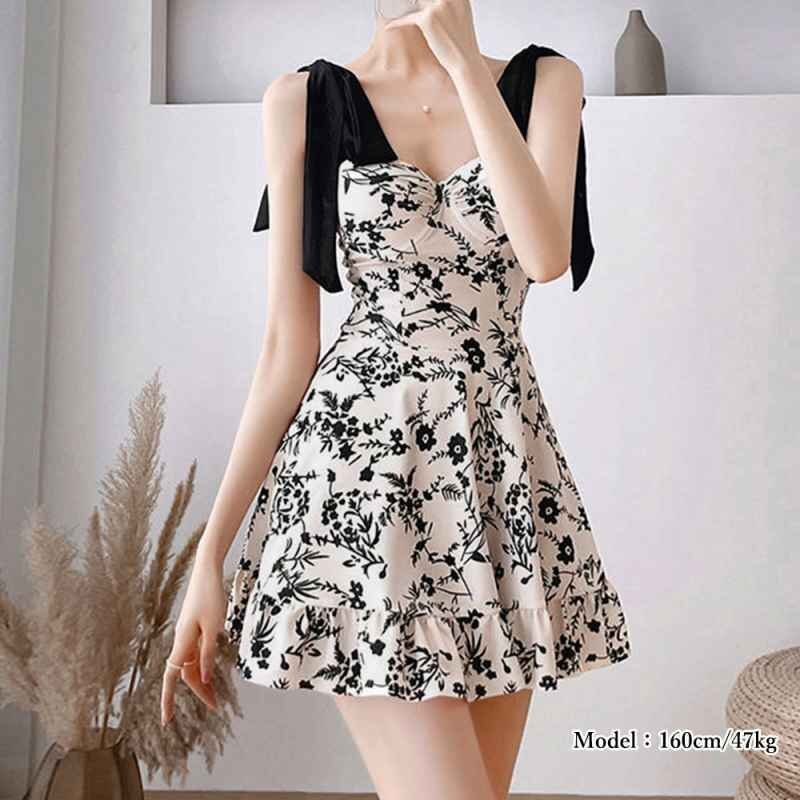 上品でシックな色合いと花柄できれいめな中に、肩のリボンがかわいらしいアクセントに。