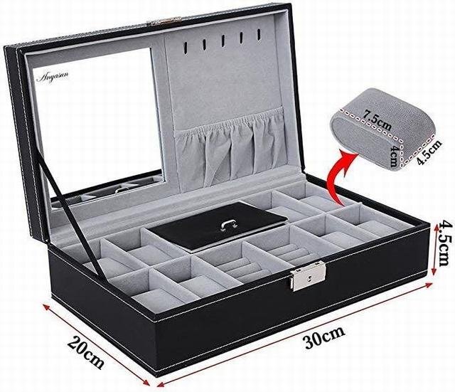 ミラーが付いていますので、ピアスを装着するときやちょっとした身だしなみを確認する際に非常に便利です。 また、便利な鍵付き、大切な腕時計やメガネを守るコレクションケースです。