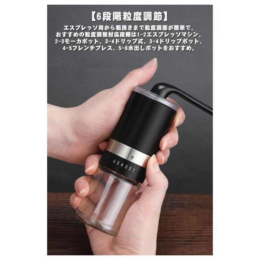 【6段階粒度調節】エスプレッソ用から粗挽きまで粒度調節が簡単で、おすすめの粒度調整対応段階は1-2エスプレッソマシン、2-3モーカポット、3-4ドリップ式、3-4ドリップポット、4-5フレンチプレス、5-6水出しポットをおすすめ。