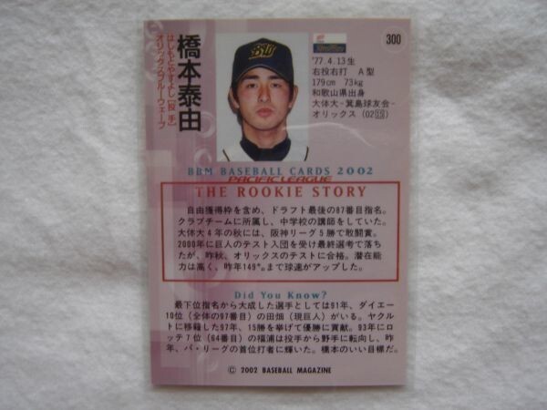 【BBM プロ野球カード 2002】No.300 橋本泰由 オリックスブルーウェーブ【トレーディングカード トレカ ベースボールマガジン社 ルーキー】
