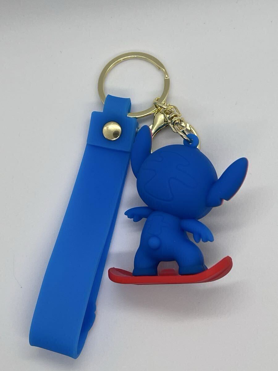 スノーボードをするスティッチのPVCキーホルダー。