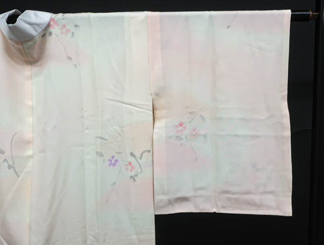 リサイクル商品のため、衿・両袖に薄シミがございますがご使用頂けると存じます。 地色はピンクです。 1枚目の画像が近いお色かと思われます。 素材は正絹です。 |