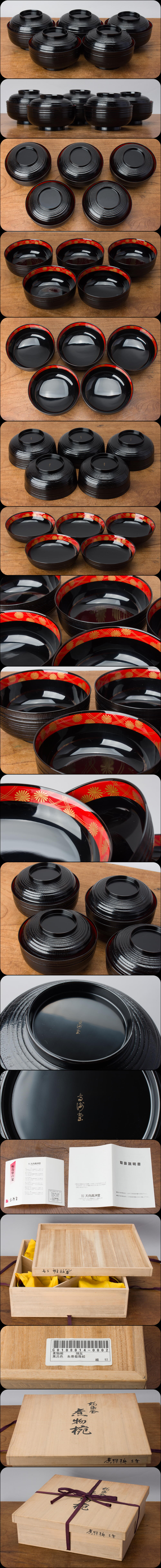 | 輪島塗、大向高州堂の朱帯菊蒔絵・煮物椀5客。元箱有。 もちろん本木地・本漆塗で、本金等を用いた手描きによる蒔絵です。 サイズは、幅約13.5cm、高さ約9.5cm(蓋込み)。 5客とも状態良好です。 傷・直し・ヤケ・歪み等ありません。 ごく薄いスレ程度はあります。 箱の蓋が割れています。 状態・詳細は、画像でご確認お願いいたします。 |