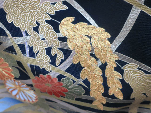 リサイクル商品のため、両袖口に汚れがございますが着用可能なお品です。 地色は 黒です。 1枚目の画像が近いお色かと思われます。 素材は正絹です。 |