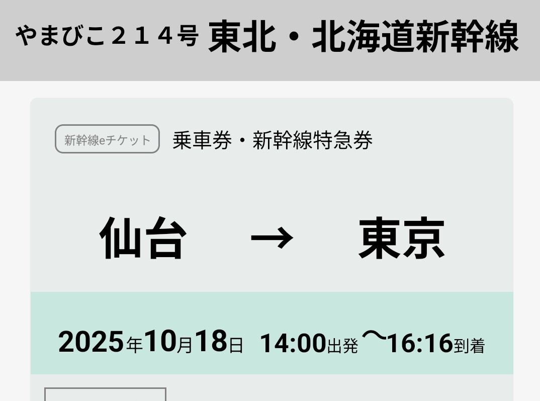 10月18日土曜日 仙台14時00分発 やまびこ214号の東京までの乗車券と座席指定券の出品です。東京駅東京は16時16分です。