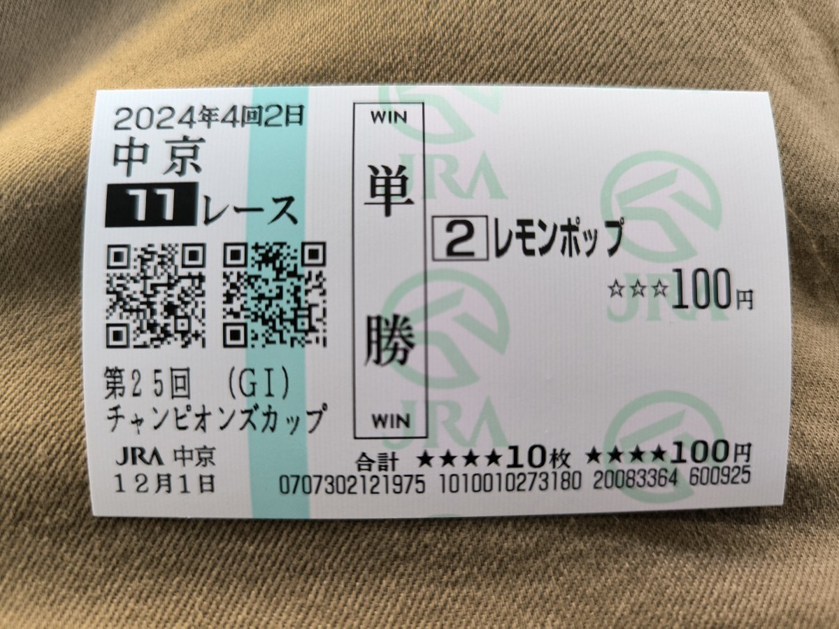 2024年中京競馬場のチャンピオンズカップのレモンポップ現地的中単勝馬券です。