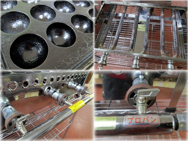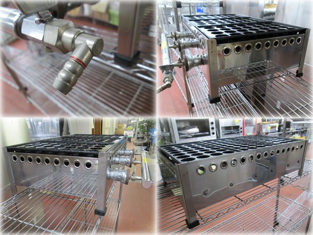 山下金物 ガスたこ焼器 を出品いたします。 ■特徴■ 業務用のガス式 たこ焼き器です。 屋台での たこ焼き作りや イベントでのタコ焼き作りに! 28穴鉄板が3枚掛けられます。 穴径:約38mm バーナー火力は各鉄板毎に調整できます。 ■仕様■