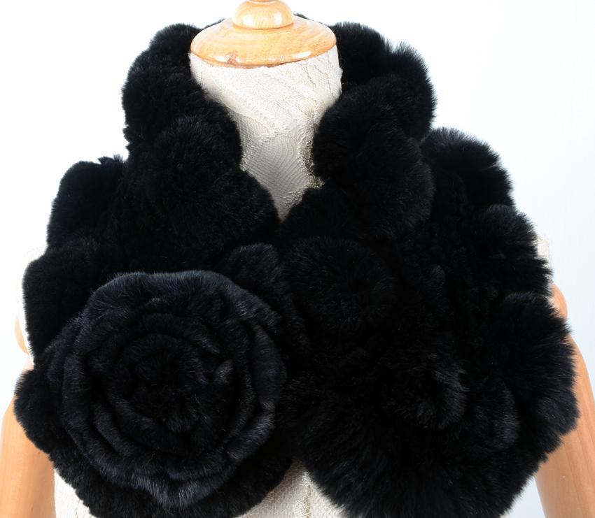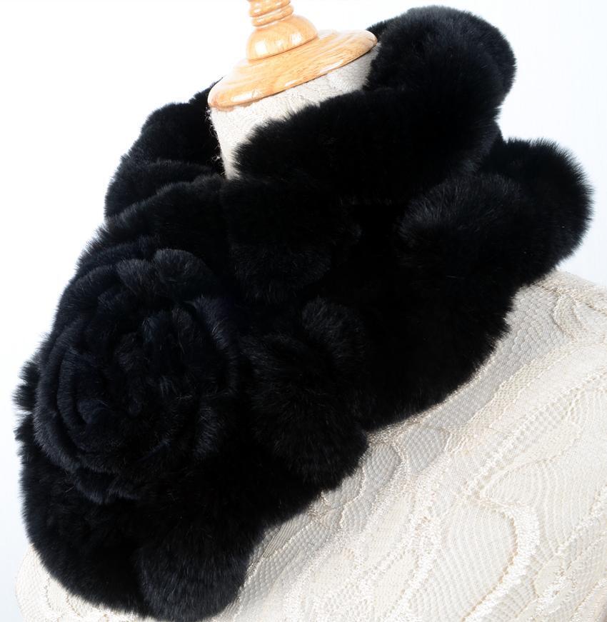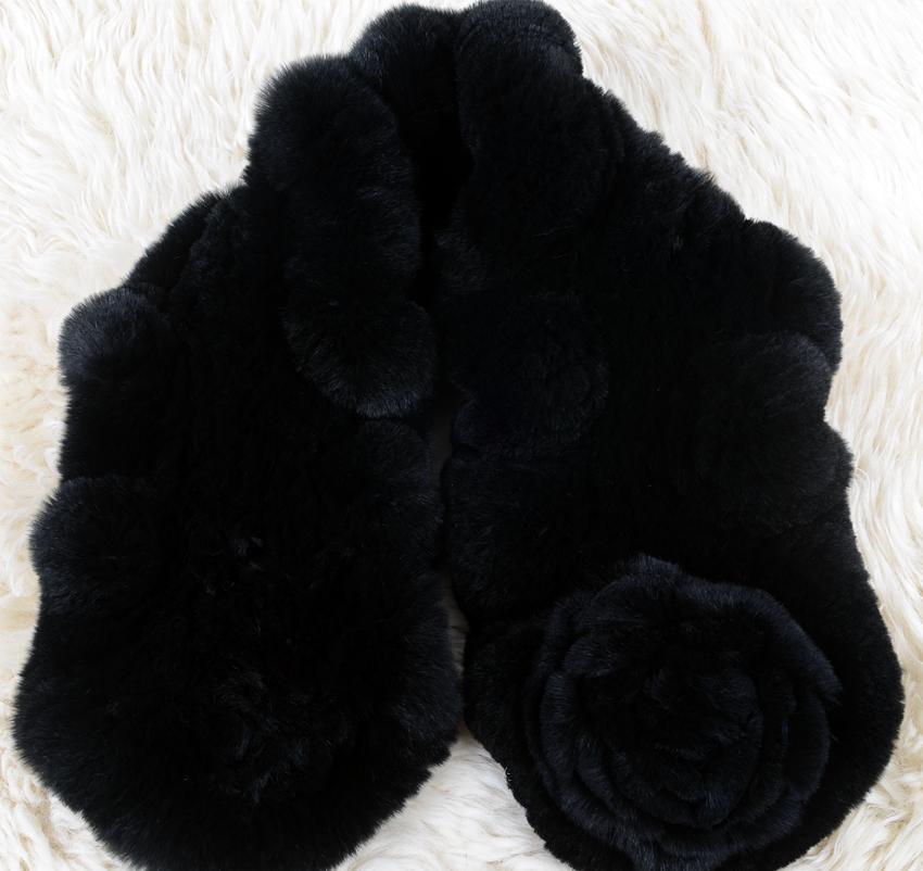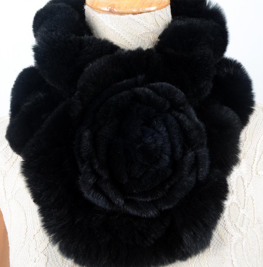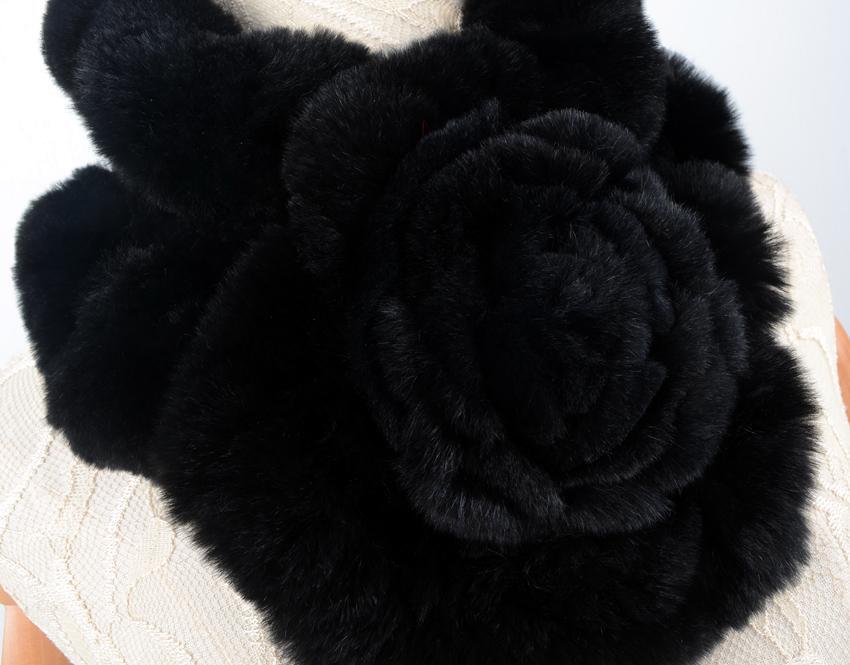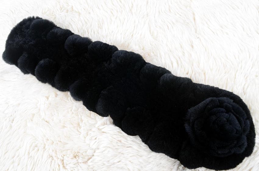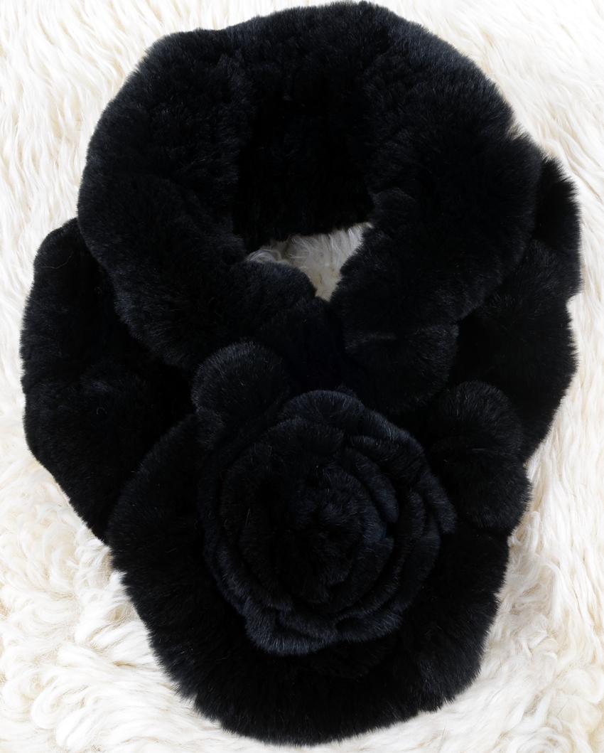 新品◆お花デザイン★上品なレッキスの編込み マフラー黒/毛皮 リアルファー | ||