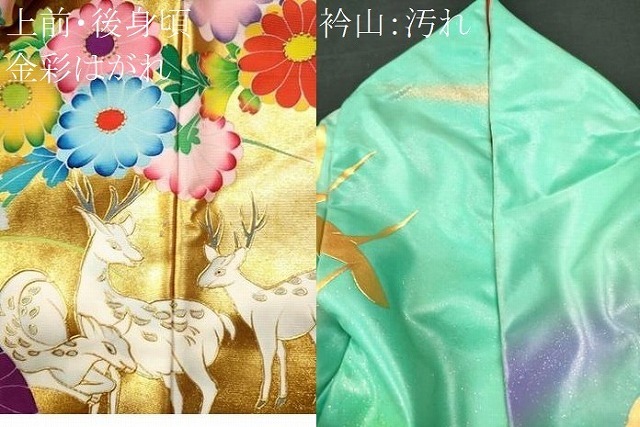 【正絹】 状態は接写画像のように上前・後身頃に金彩の剥がれ、衿山に薄い汚れがございますが その他特に目立ったシミ汚れなどもなく大変良い状態です。 大変上質な逸品になります。 お安く出品致しますので、是非この機会にいかがでしょうか? |