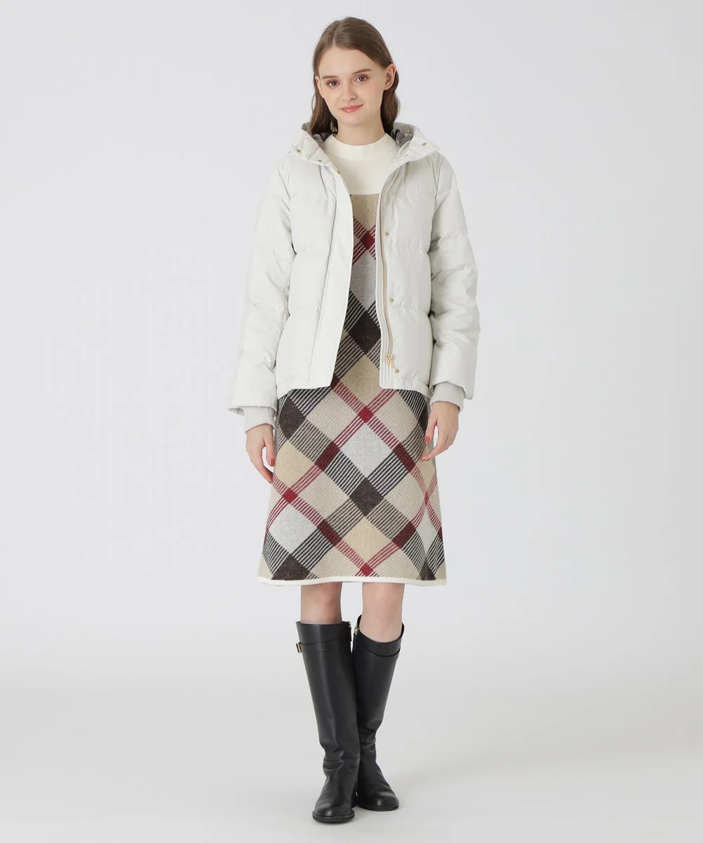 フードが顔周りに立ち上がるデザインがポイントのショートダウン。脇の切替線を前身頃側にふることで、細見え効果をもたらします。ポケットは手を入れやすい位置に付けています。