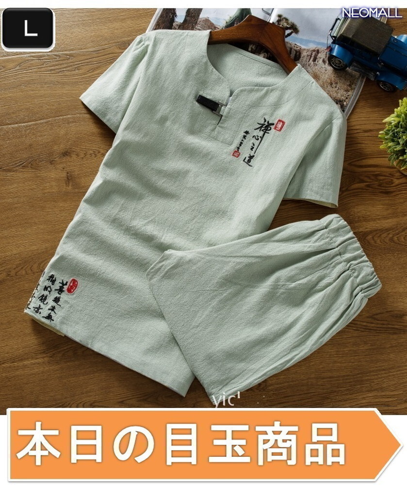 1スタ☆【299】 新品 サマーコットン ヘンリーネック セットアップ グリーン Lサイズ 春 夏 部屋着 ルームウエア