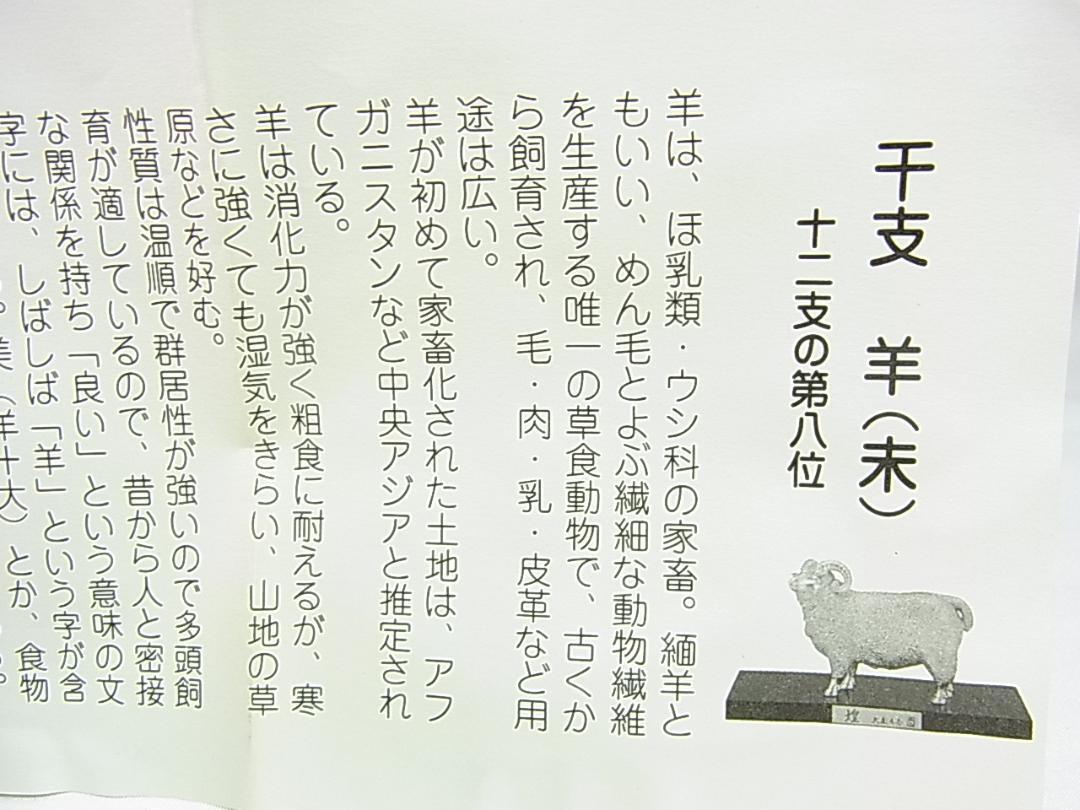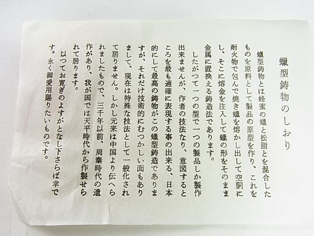 【商品詳細】 高岡銅器の伝統技術を継承する名工・大森孝志氏による「春風」シリーズの干支置物、羊(未)でございます。 蝋型鋳造による青銅製で、羊毛の一本一本まで丁寧に表現された精緻な造形は、高岡銅器ならではの重厚感と温かみを感じさせます。 サイズ:全長 約16cm × 高さ 約11cm 重量:約1391g ずっしり重いです 素材:銅製(蝋型鋳造) 付属品:共箱、しおり、解説書付き 【縁起・象徴】 羊は「家族安泰」「平和」「温和」の象徴とされ、古来より吉祥の干支として大切にされてきました。 群れをなして暮らすことから「家族の絆」「円満」「繁栄」を意味し、家庭や事業の安定を願う縁起物として喜ばれています。 また、干支「未」は十二支の中でも「芽が出る」「成長する」ことを暗示し、福運を招くと伝えられています。 【特徴】 ・蝋型鋳造による精緻で写実的な造形。 ・柔らかな羊毛の質感と堂々たる姿が調和した工芸美。 ・福運を招く縁起の置物として、玄関や床の間、応接室に最適。 ・共箱・解説書付きですが 台座の敷物はありません 【状態】 目立つ傷や汚れはなく、良好なコンディションです。金属特有の経年による自然な風合い(くすみ等)がございますが、むしろ味わい深さを引き立てています。 ※インボイス 領収書の発行はしておりません |