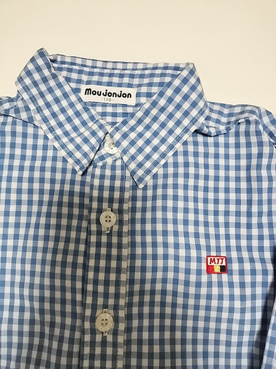 青と白のチェック柄の長袖シャツ、サイズ110、Moujonjonブランドの小さなロゴ刺繍付き。