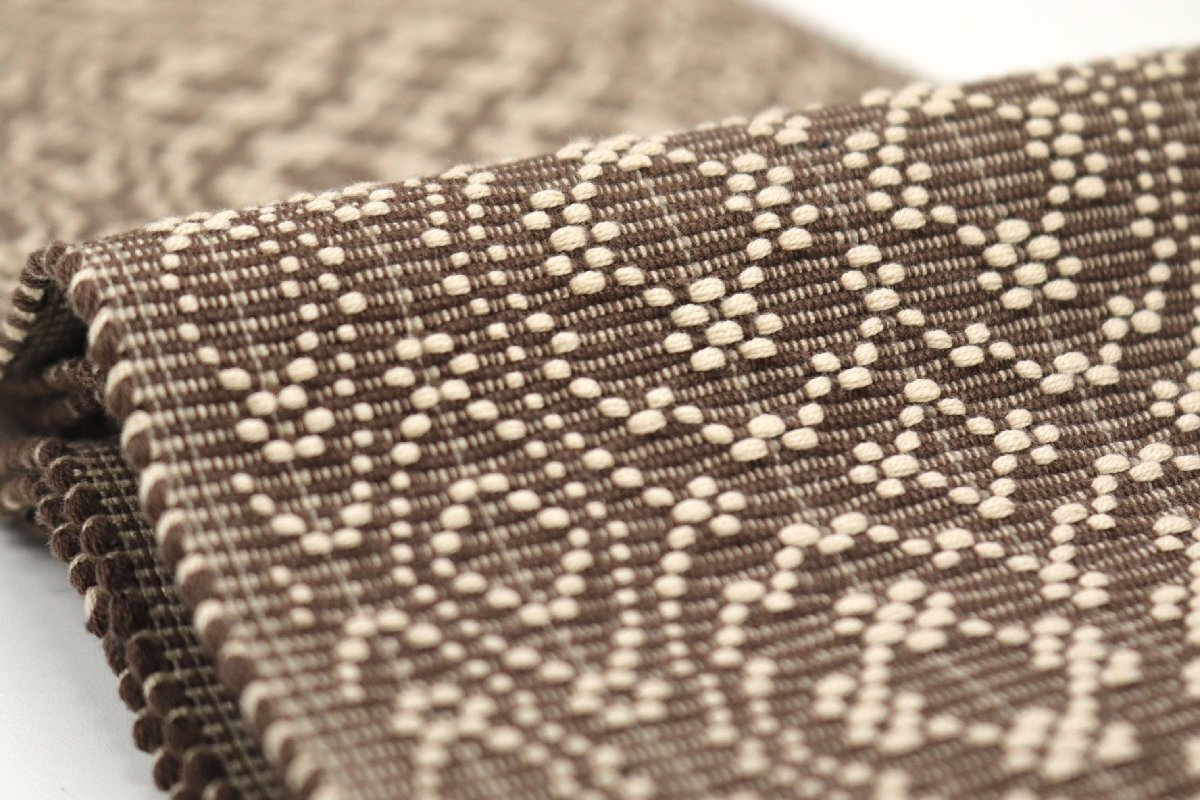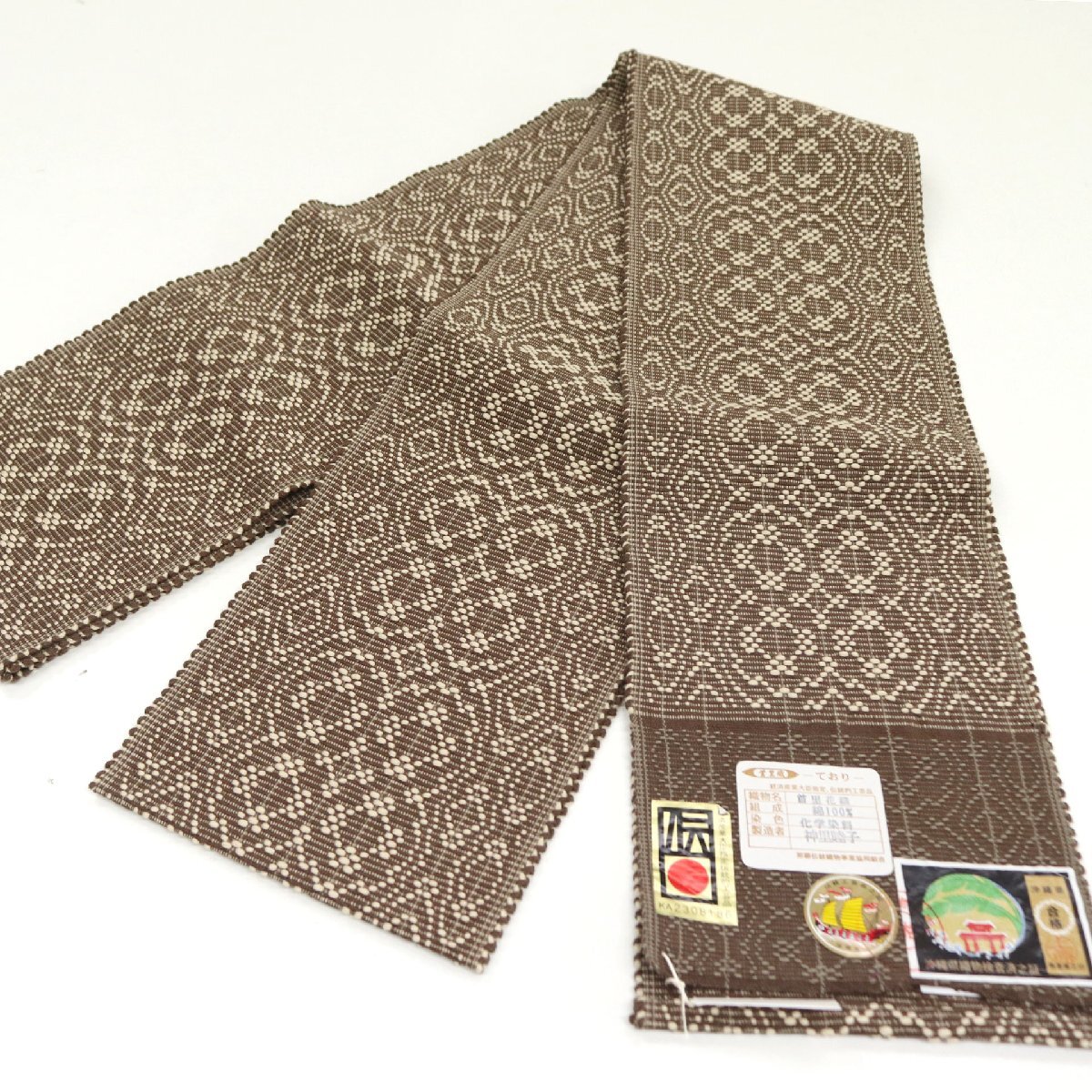 ややコシのある帯地は、焦げ茶色のお色目でございます。全体には、アイボリー色で花織の柄が規則正しく織り込まれており、お洒落でございます。