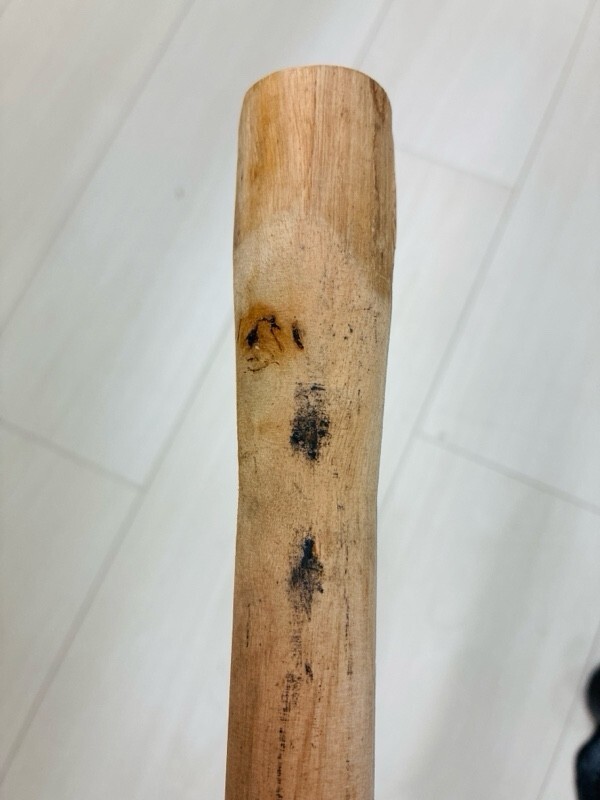 柄の部分に見られる黒い箇所は、刃の塗装が付着したものです。