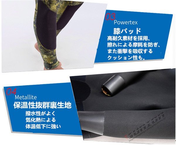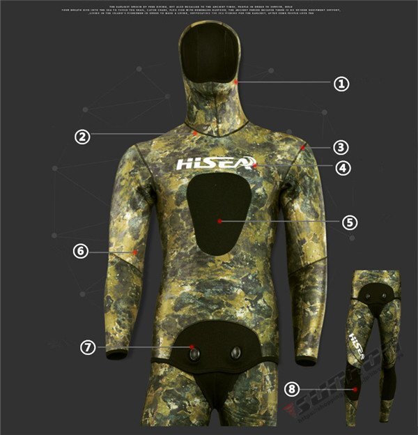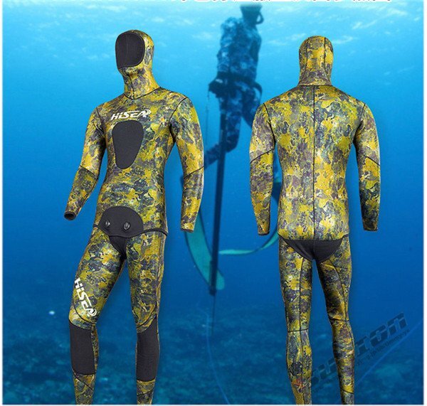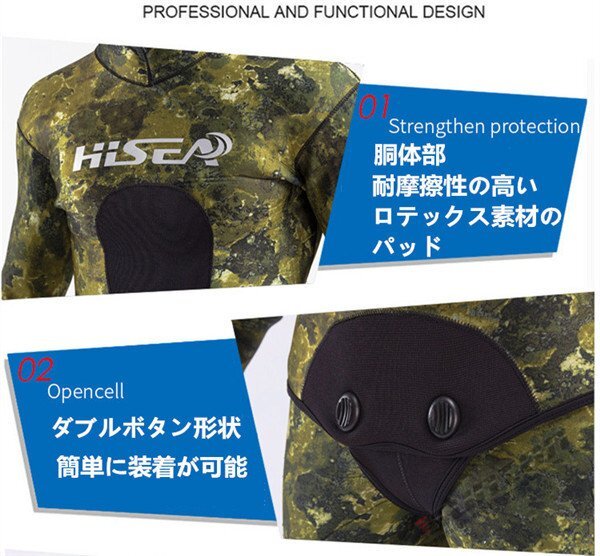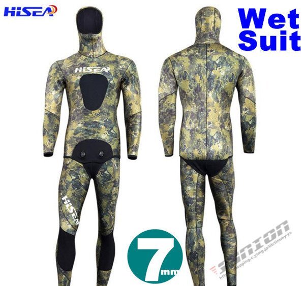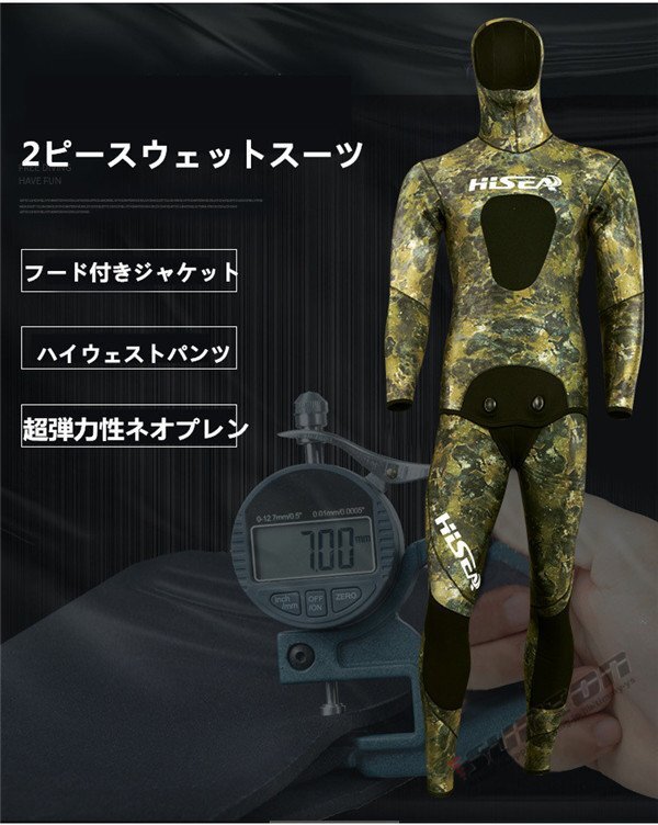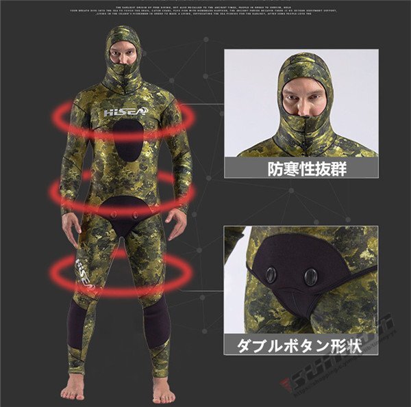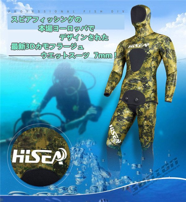 【商品説明】【ブランド】 HISEA【サイズ】S,M,L,XL,XXL【厚 さ】 7mm○2ピースウェットスーツ○フード付きジャケット○ハイウェストパンツ○ダブルボタン形状○表面素材:超弾力性ネオプレン 通気性に大変優れており、簡単に装着が可能です。○内部素材:オープンセルネオプレン○胴体部と膝の部分にオリジナルの耐摩擦性の高いロテックス素材のパッド仕様☆素材は優れた弾性新世代のネオプレンです。優れた機能性と高い保温性ができます。日本特有の地磯、岩礁地帯や海藻が生えた海底にマッチおり、優れたカモフラージュ機能を発揮します☆スムーススキンの生地は、撥水性がよく気化熱による体温低下に強いため、海面で長時間過ごすフリーダイバー、スキンダイバーには人気です。【保管について】☆海から上がったら、なるべく早めに洗う。☆熱いお湯はNG、必ず水かぬるま湯で洗う。☆乾燥は直射日光を避け、細いハンガーは使用しない。しっかりと乾燥したら、なるべく早めに表面へ戻す。