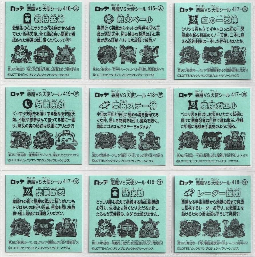 ビックリマン 第36弾 シール ロッテ 天使 悪魔 お守り 9枚 紅の一忍神 安眠熟如 祝桜益神 鎮火ベール 受宙ステー神 蛾魔ガエル 葉隠助忍 他