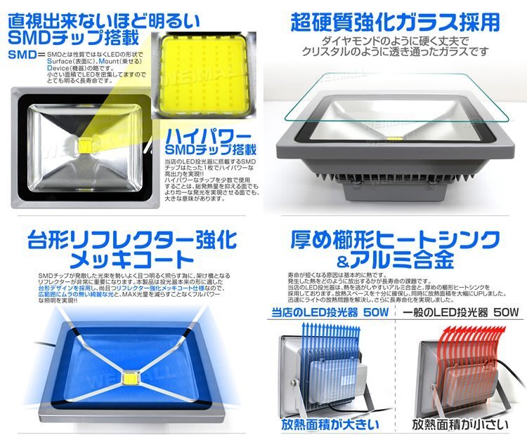 | 熱を逃しやすいアルミ合金 と放熱フインでさらに長寿命化! 高輝度50W LED(SMDチップ)を使用した投光器です。 50Wと省電力で500W相当の明るさです! 照射角約120°で広範囲を照らします! 照射面に強化ガラスを使用し、長期間の使用でもクリアな光を照射します。 IP65規格の防水仕様! 場所を選ばず様々な用途の照明に使えます。 ライトの上下多角度を調整出来るようになっていますので、とても便利です! |