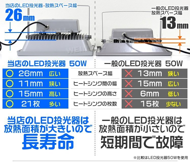 | 消費電力 : 50W (500W相当) ルーメン数 : 4300LM 防水レベル : IP65 照射角 : 広角120° 重量(約) : 2.6kg |