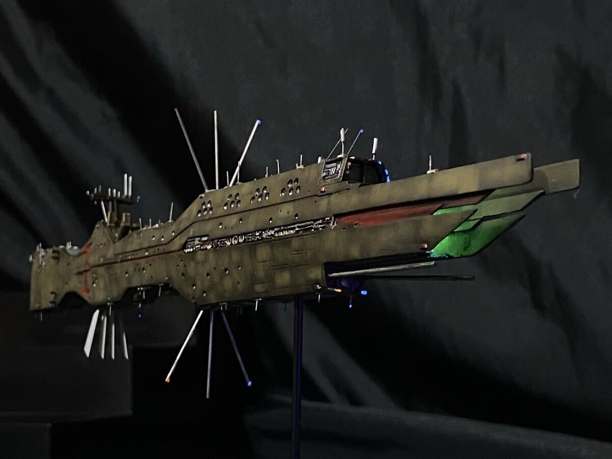 私オリジナル調色の自由惑星同盟軍総旗艦艦艇色をベースにマスキングテープによるパネルライン表現、その上から5段階の茶系のグラデーションを施ししております。メインエンジン部は蛍光イエローを吹きつけておりますのでブラックライトを照射してる時間だけ発光します。また艦舷灯は蛍光クリアーレッド/ブルーで塗装済みでブラックライトで発光。艶消しスムーズクリアーでコーティング済み。