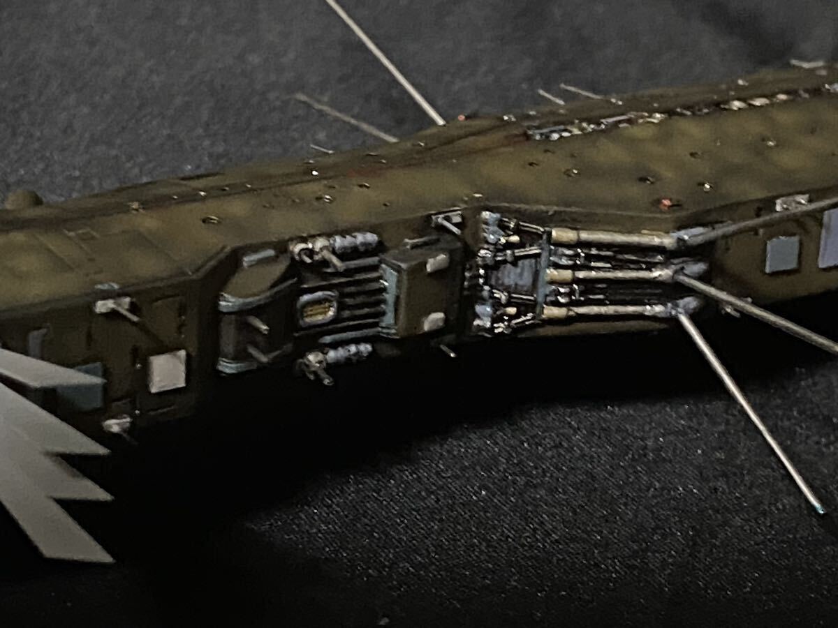 劇場版「新たなる戦いの序曲」でのパトロクロスのシャトル発進シーンを参考にメタルパーム一体のシャトル開口部を市販のスジボリ入りのプラ板でシャッターを追加、センターピラー、一段高い甲板、左右の張り出し等ディテールを追加格納庫上のセンサーは真鍮パイプと真鍮線で再現。各部アンテナを真鍮線で44箇所追加(アンテナ基部をプラ材で31箇所追加。)メインマスト上部にも追加しております。劇中で見られる主砲モジュール左右舷にある測距儀はプラ板で8箇所(真鍮線補強済み)を追加。艦舷灯がより立体的に見えるようプラ材で18箇所追加してます。船体上下にプラ材によるパッチを20箇所追加。Nゲージのアンテナパーツ等でディテールをアップさせております。