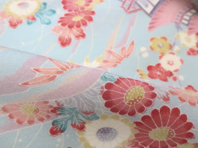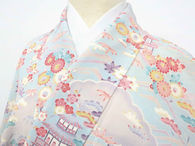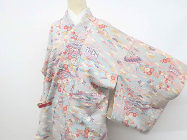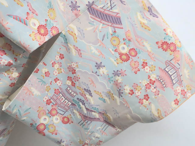 リサイクル商品のため、身頃や衽、両袖、衿、胴裏など全体の所々にシミがございます。 地色は灰水色です。 1枚目の画像が近いお色かと思われます。 素材は正絹です。 |