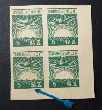 5銭  旭日と戦斗機    田型  (銭の下変種)  未使用    美品。