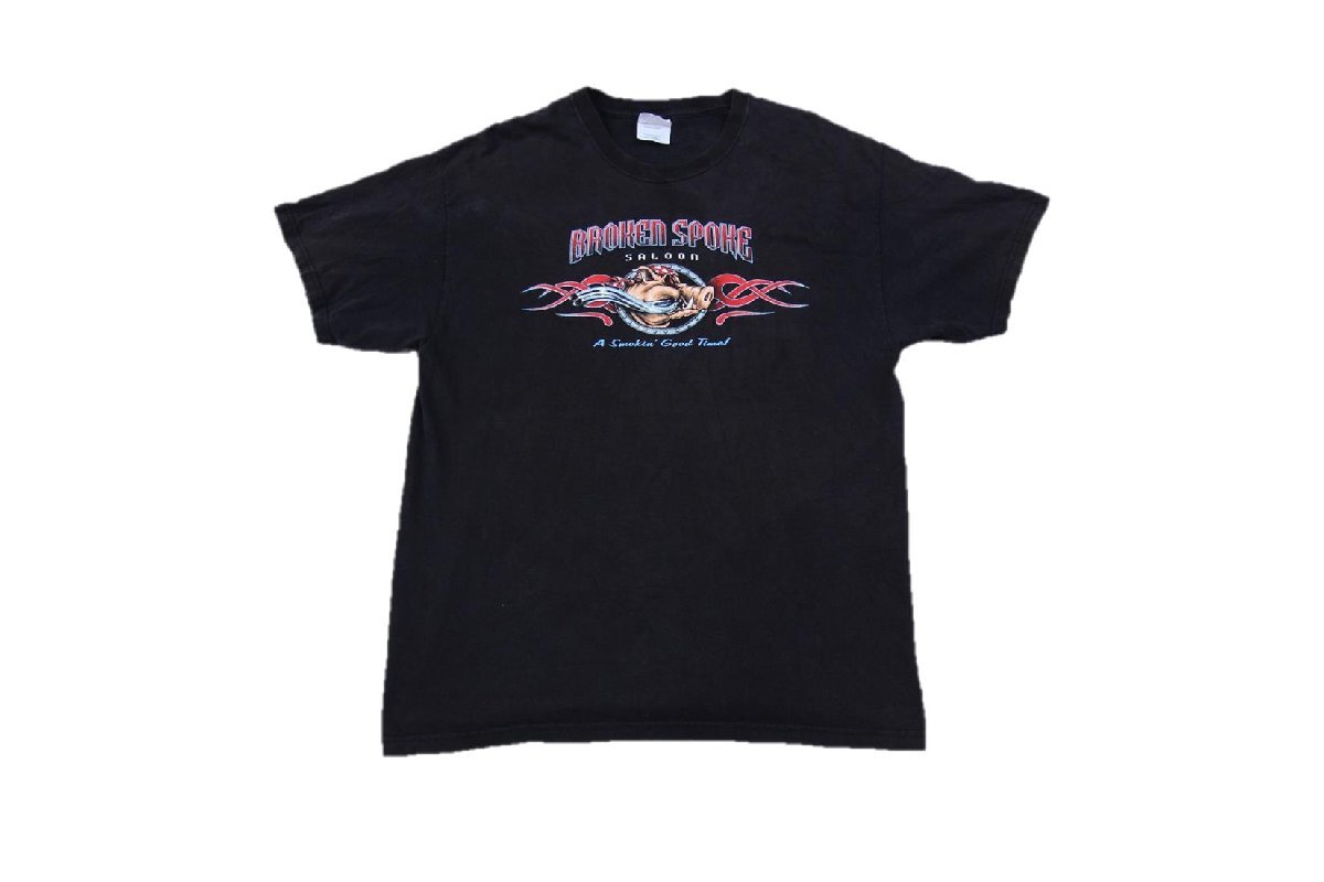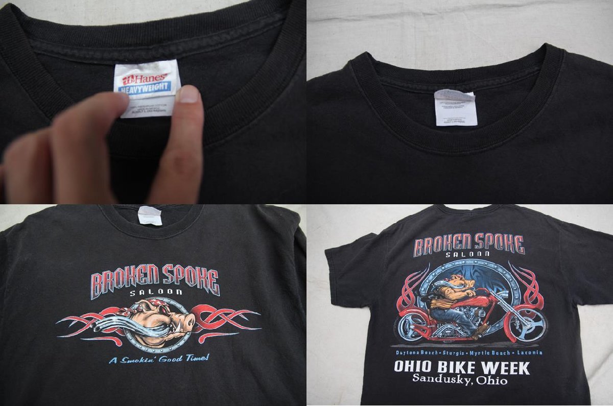 1990年代以降頃のHanes製モーターサイクルプリントTシャツとなります。フロント、バックの両面プリント入りでアメリカサウスダコタ州に位置するバイカーショップ「Broken Spoke Saloon」のTシャツで、バックに今も開催され続けているアメリカ最大級のバイクイベントであるOhio Bike Weekのプリントも入る事からイベント出店様に作られたもしくはイベント販促用のTシャツかと思われます。豚がバイクに乗るデザインはバイカーTシャツらしいクールなプリントですし、サイズもLの大き目サイズと大変良いサイズ感ですのでお好きな方は是非ご検討下さい。